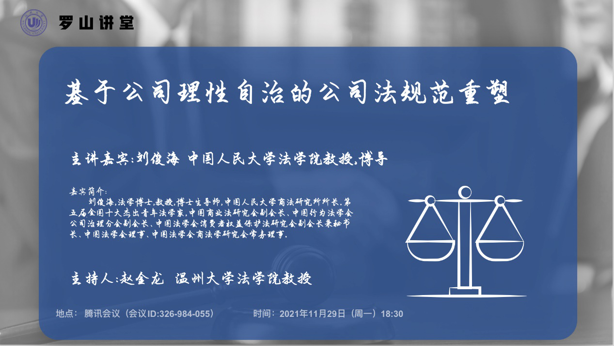 2021年11月29日晚,中国人民大学麻豆在线 刘俊海教授作客温州大学罗山讲堂,为我校师生做题为《基于公司理性自治的公司法规范重塑》的讲座,在麻豆在线 301室和腾讯会议直播间,麻豆在线 师生共计300余人以线上线下相结合的方式参与了此次讲座。