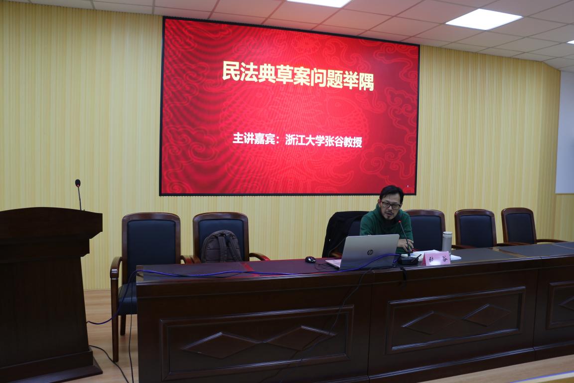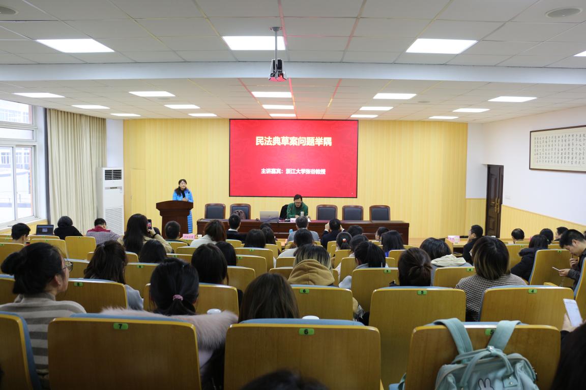2018年12月14日下午,温州法治大讲坛专题讲座特邀浙江大学张谷教授主讲《民法典草案问题举隅》,温州大学法政学院法学系主任何平主持,平阳法院、市律协、学院师生逾百人参加讲座。