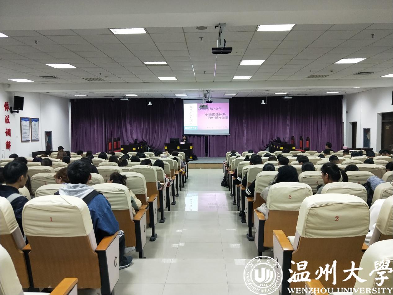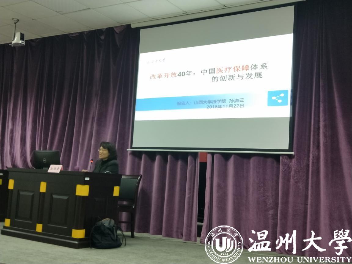 2018年11月22日晚,山西大学教授、麻豆在线 博士生导师孙淑云教授在温州大学法政学院模拟法庭开展专题讲座,讲座由周湖勇老师主持,法政学院的研究生和本科生同学以及法学界共130多人参加了本次讲座。本次讲座的主题为“改革开放40周年以来我国医保体系的创新与发展”。