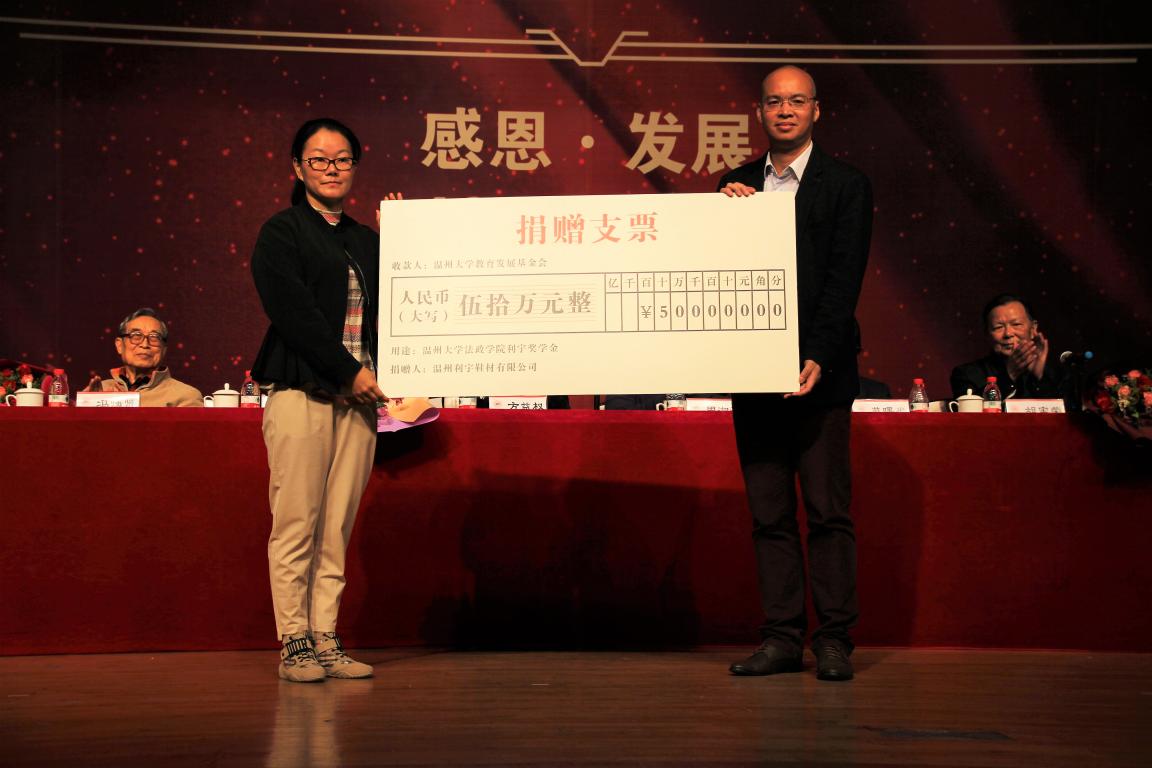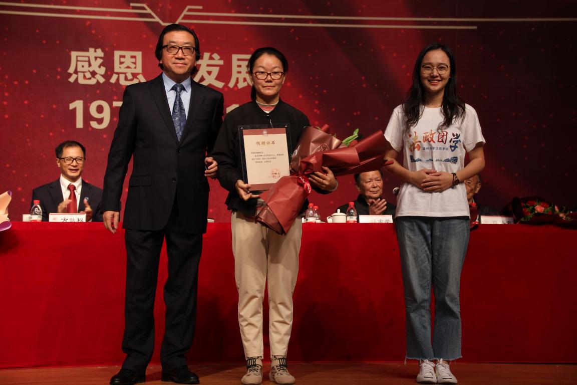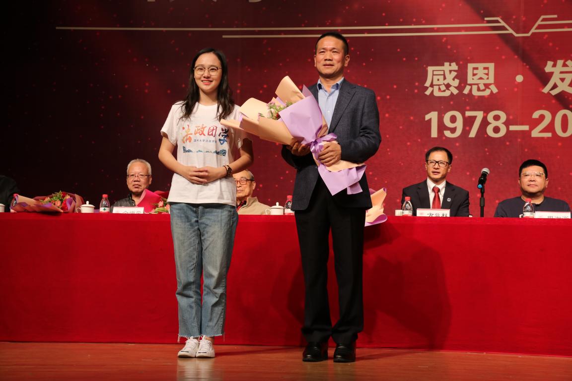 随后,由在校生代表向为学院教育事业做出卓越贡献的退休老教师代表献花、向翁学院校友代表献花;王宗正院长代表学院接受杰出院友谢璐捐赠的50万元用于学院学科发展和人才培养,温州大学副校长蔡曙光向杰出院友谢璐颁发捐赠证书,随后在校生代表向院友谢璐献花致敬。上午庆典在合影留念中圆满结束。