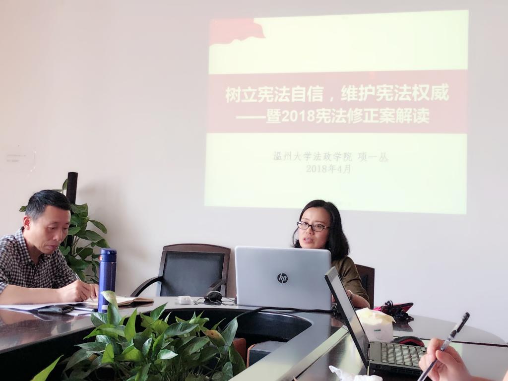 缪心毫副院长做了教学工作布置,着重强调毕业论文答辩工作安排和中期教学检查;法学系项一丛老师作了《树立宪法自信,维护宪法权威》的讲座,对2018宪法修正案做深入浅出的解读。