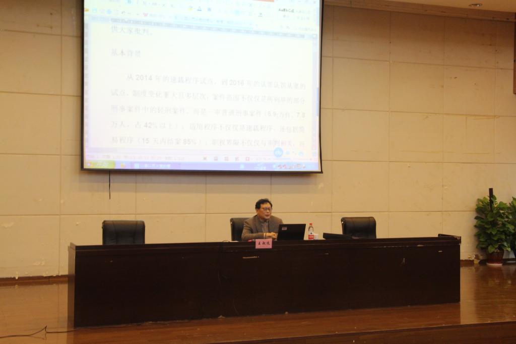 讲座中,王敏远教授首先从2014年的速裁程序试点,到2016年的认罪认罚从宽制度的试点的背景讲起,主要集中讲了三个问题:一是认罪认罚从宽制度的正当性问题;在诉讼环节上,由于案多人少、程序要求严格以及权利保障和对司法公正的更高需要等,需要该制度提高诉讼效率,优化司法资源配置。在具体程度上,随该制度而生的协商不可避免,为防止质疑正当性,该协商应有“度”,且程序上要有完善的设计。二是认罪认罚从宽的程序法视角问题;阐述到该制度并不仅仅是程序法的问题,也涉及实体法的问题,比如主观恶性程度的标识。三是认罪认罚从宽制度应高度警惕的问题;王教授认为,完善该制度对诉讼各方、社会以及法治发展均是具有积极的改革意义的,但是凡事有利弊,指出应当关注几个问题:(一)冤错案件的预防——针对实际发生的不真实认罪案件;(二)辩护权的保障——以实践中的值班律师分析;(三)民事赔偿与刑事惩罚协调问题——以刑事和解为例的分析。