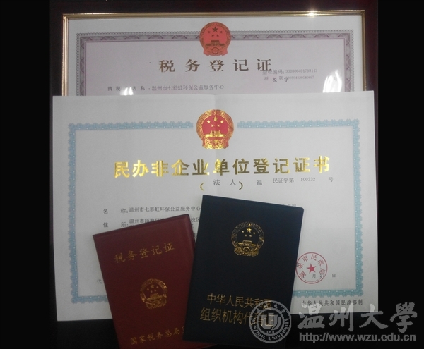 近日,温州大学法政学院七彩虹环境法治联盟的大学生环保志愿者在温州市民政局注册登记民办非企业单位,名称为"温州市七彩虹环保公益服务中心",业务范围包括环境保护公益服务活动,承接政府职能转移和购买服务事项。注册后,结合七彩虹社团以往的活动经验和基础,由专职的环保公益人与大学生志愿者共同开展环保公益活动。据了解,这是温州市第一家由大学生环保社团志愿者注册成功的民办非企业单位。
