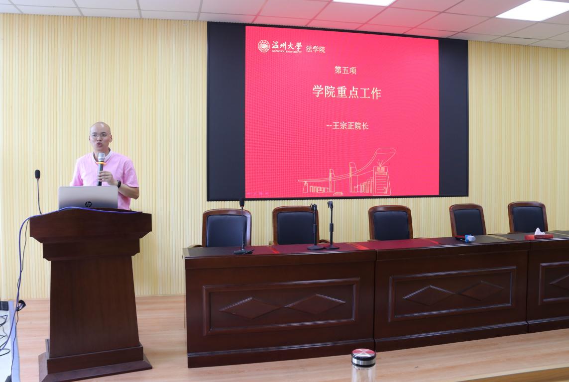 缪心毫副院长做了关于科研和留学生等工作布置,在科研方面推行院级科研项目与院级科研机构培育计划,鼓励青年教师积极投身科研;通过学术会议、讲座、沙龙等多种形式营造浓厚的科研氛围,在科研项目特别是国家社科基金的申报上提早规划、多方筹划;在学位点的建设上,本学年重点着力于行政管理一级学位硕士点和MPA专业学位点的申报。在研究生培养上,推行研究生导师组培养方式,出台导师评估办法,提升研究生的培养质量,调整研究生奖励方案,重心向科研倾斜,优化研究生培养方案。在留学生培养上,进一步优化培养方案,强化教学管理。在地方合作上,引入民商事仲裁,成立世界温商仲裁院和温州市仲裁研究院,推进与瓯海法院的合作,成立巡回法庭,多方位构建比较完善的法学实践基地,以反哺师生,推进科研。