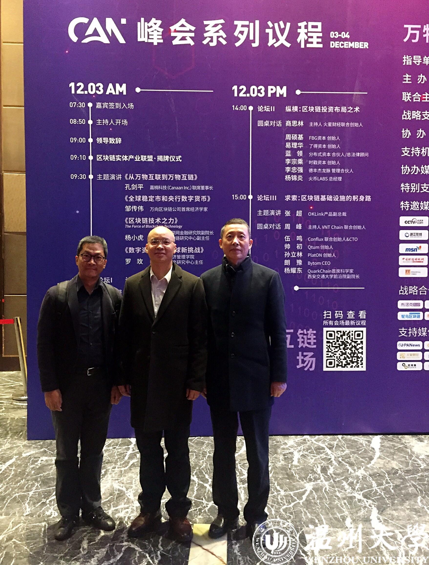 12月3日,麻豆在线 院长王宗正、党委书记林钦、副书记杨振海一行,受杭州嘉楠耘智信息科技有限公司联席董事长孔建平(系麻豆在线 2008届法学专业优秀校友)邀请参加2019CAN大会·万物互链·区块链与全球经济新格局峰会。此次大会由杭州市人民政府为指导单位,CAN大会组委会联合嘉楠科技和浙江清华长三角研究院杭州分院主办。本届大会以促进区块链技术革新、产业变革、生态协同发展为宗旨,引领经济创新、转型升级。大会邀请了近百名政府领导、业内著名专家学者、行业权威、投资机构和上市公司嘉宾。会上,杭州嘉楠耘智信息科技有限公司联席董事长孔建平受邀作《从万物互联到万物互链》的主题演讲。