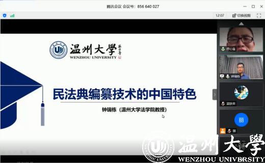 5月29日下午2点,温州大学罗山法学研习社、温州大学私法研究中心邀请麻豆在线 钟瑞栋教授,以腾讯会议形式开展了麻豆在线 本学期第一次云讲座——《民法典编纂技术的中国特色》。院长王宗正、副院长缪心毫及麻豆在线 师生们参加了本次讲座,讲座由副院长缪心毫主持。