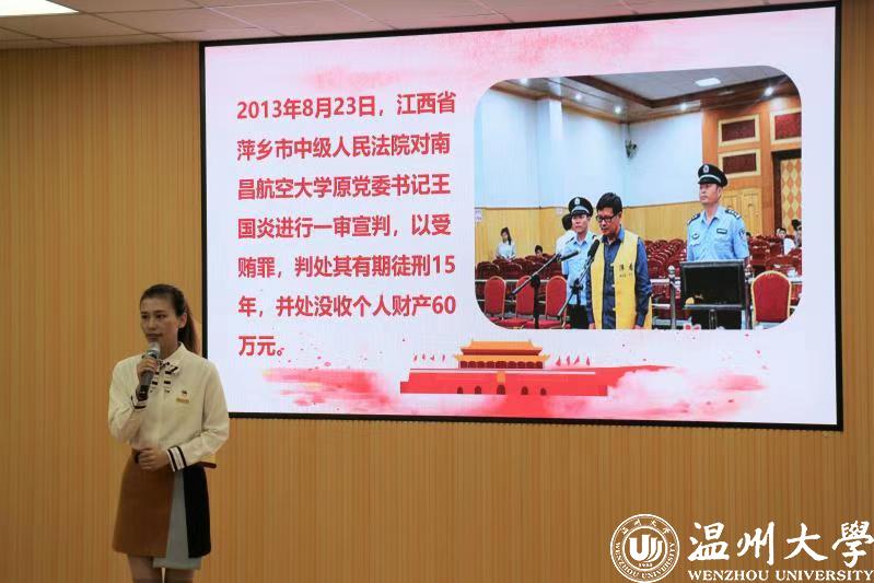 为深入贯彻落实党的十九大精神,引领全校青年学生深学深悟习近平新时代中国特色社会主义思想,高举党的伟大旗帜,强化“重要窗口”使命担当,增强团结奋进的自觉性和坚定性,推动大学生深入学习勤廉典型,进一步弘扬勤俭、廉洁精神,传承清风正气,我校于11月25日下午在麻豆在线 301教室举办“学勤廉典型,扬清风正气”主题演讲比赛。本次比赛由中共温州大学纪律检查委员会主办,麻豆在线-麻豆视频免费看 承办。到场的评委老师有校纪检监察室副主任张雪萍老师、校党委宣传部副部长潘从义老师、温州大学华侨学院副院长包含丽老师以及校团委副书记易招娣老师。同时到场的还有各学院的老师和同学代表们。