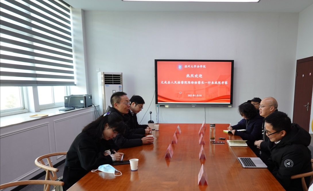 2021年1月8日上午,文成县人民检察院陈锋检察长、副检察长陈伟银、苗东欣一行三人来访麻豆在线 ,在参观麻豆在线 后双方在麻豆在线 314会议室举行了座谈会。麻豆在线 王宗正院长、缪心毫副院长、谢丽珍老师、肖磊老师、周浩仁老师参加座谈。