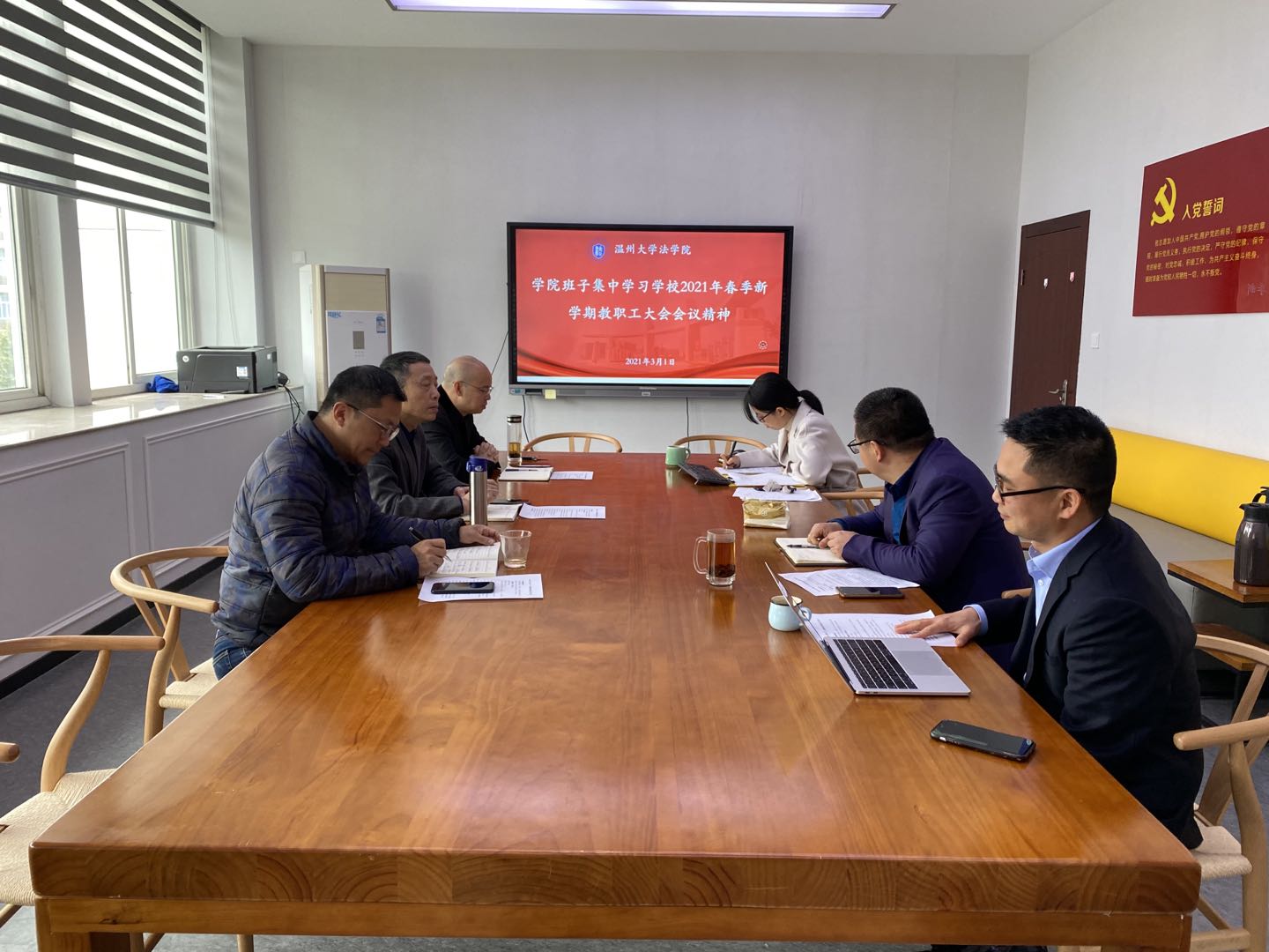 3月1日上午,麻豆在线 召开学院领导班子碰头会,集中学习学校2021年春季新学期教职工大会会议精神。围绕教职工大会上谢树华书记《立足新阶段 扛起新使命 激发新动能 确保温州大学“十四五”发展开好局起好步》的大会讲话和赵敏校长《抢抓机遇锚定目标 乘势而上 全力谱写新时代学校高质量发展新篇章》的工作报告,班子成员基于各自工作,结合学校目标任务与学校“锚定3818,奋进2021”的主题主线,深入探讨学院中心任务与重点工作。