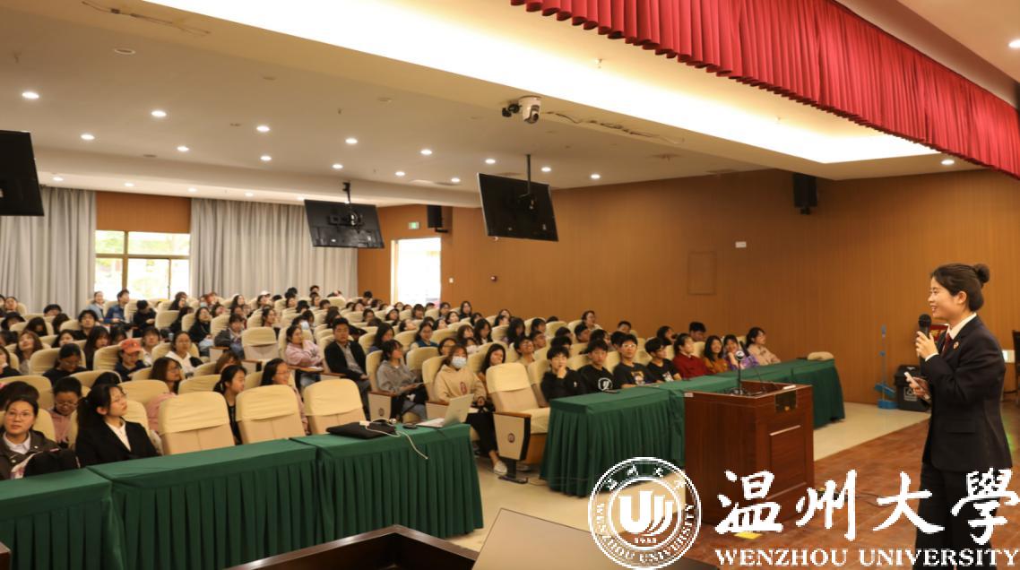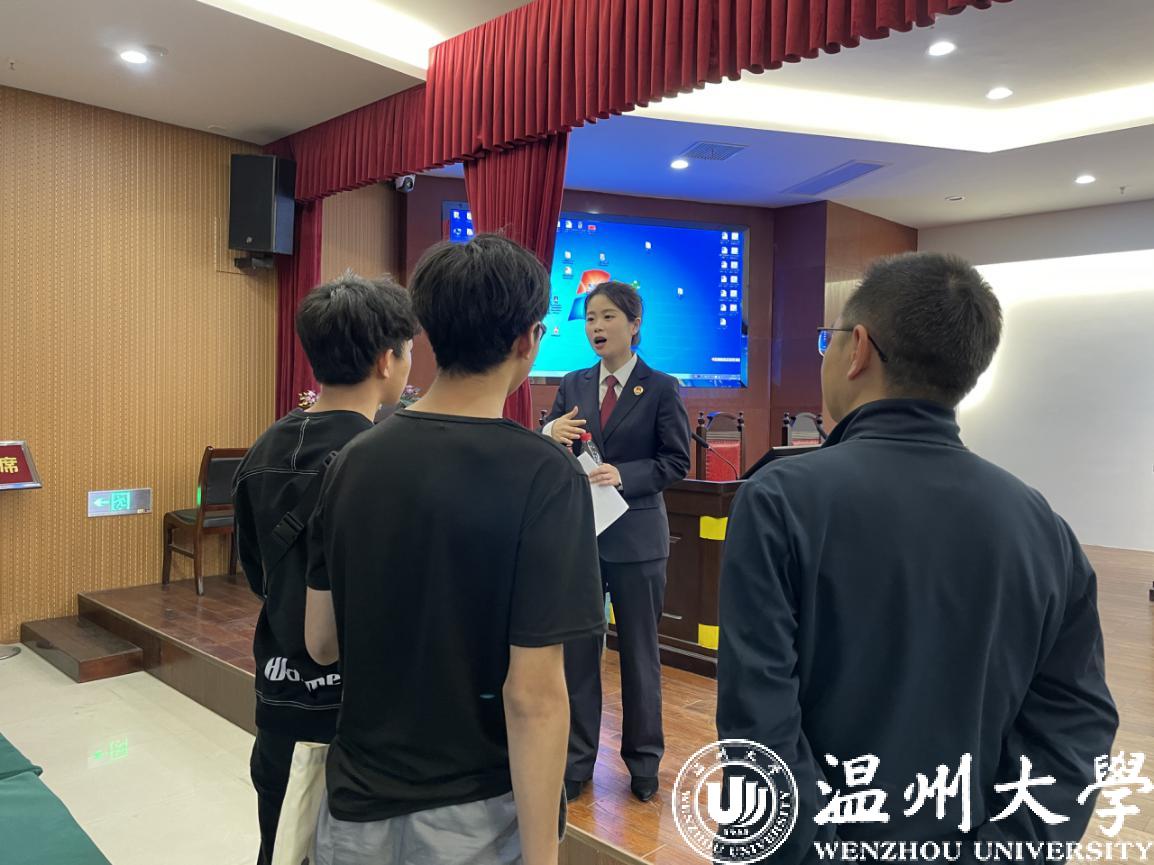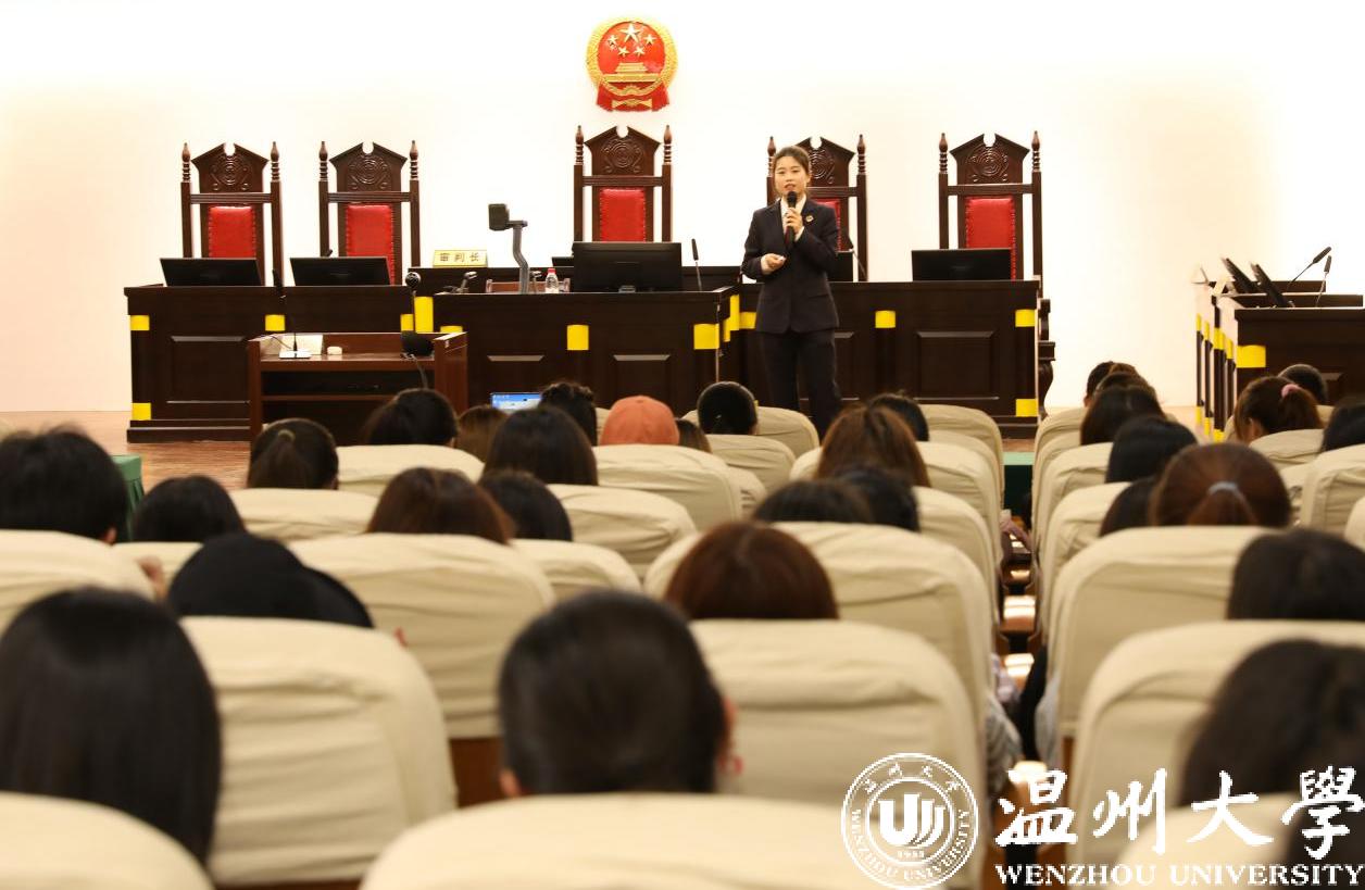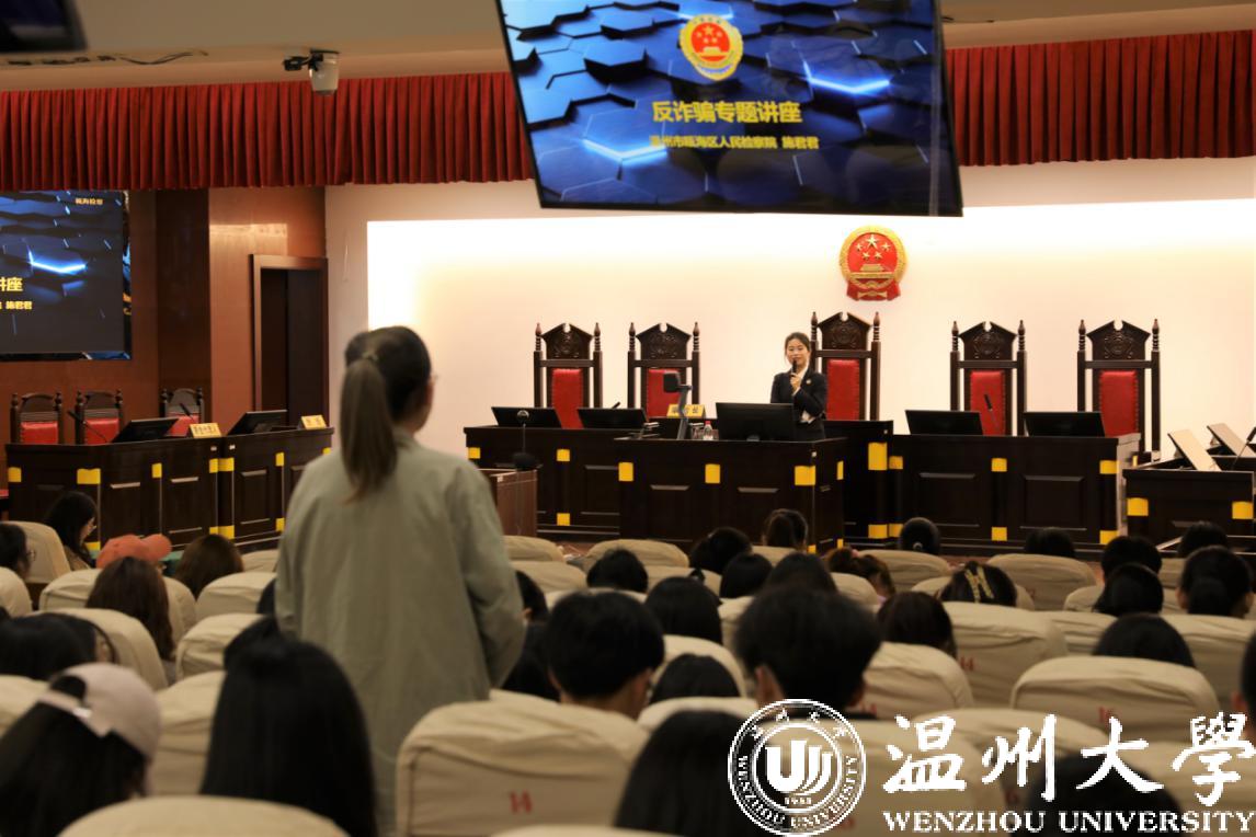 为切实做好安全宣传教育,增强学生防诈反诈意识,营造平安和谐的校园环境,4月7日下午,麻豆在线 于北校区模拟法庭组织了防诈骗专题讲座。讲座由林丽丽老师主持,特别邀请到温州市瓯海区人民检察院检察官施君君为同学们主讲。