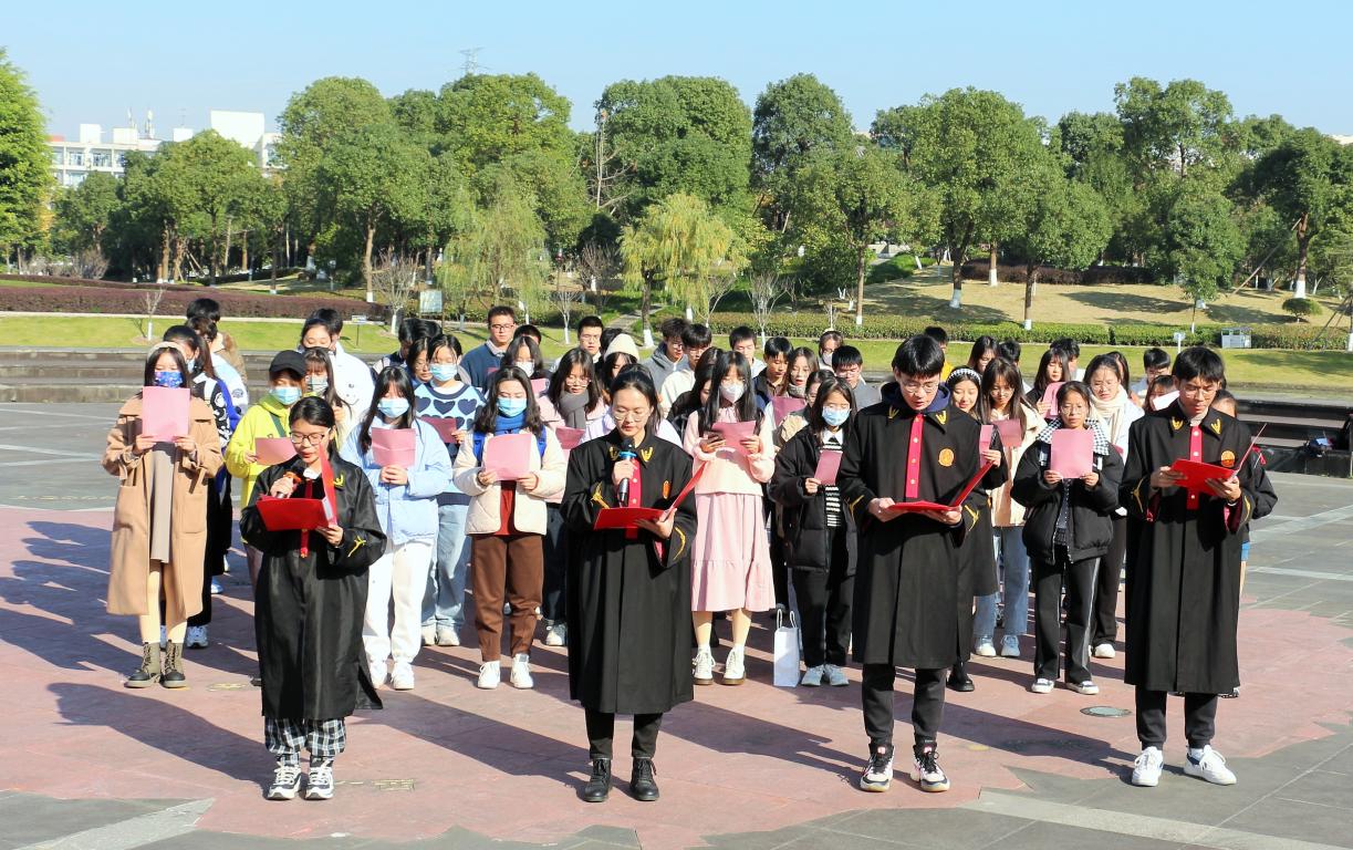 “中华人民共和国公民在法律面前一律平等。国家尊重和保障人权……”12月4日9:00,温州大学学生代表齐聚国旗广场晨读晓宪法,感悟国家根本大法的至高权威与光荣历史。
