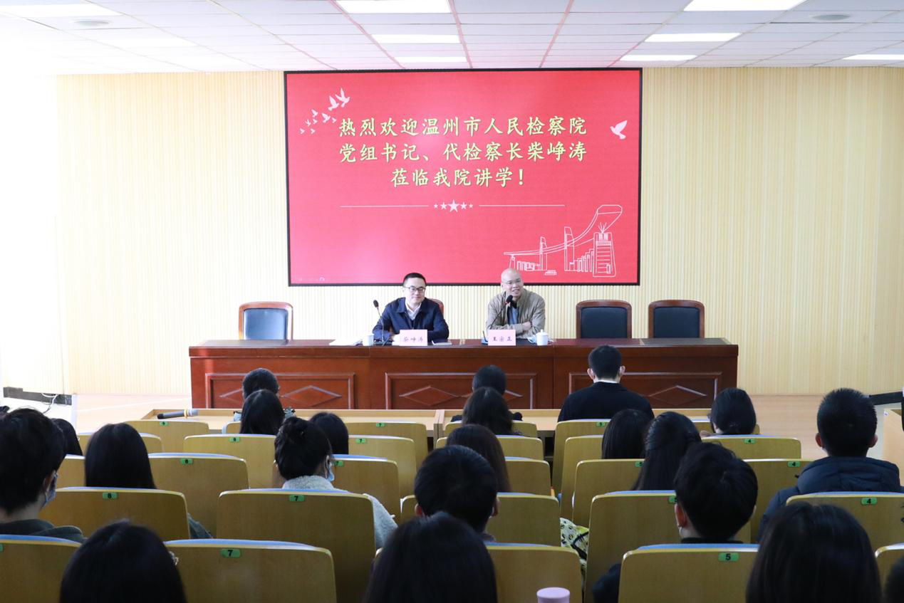 2021年12月9日上午,温州市人民检察院党组书记、代检察长柴峥涛同志来麻豆在线-麻豆视频免费看 讲学,校党委书记谢树华、校长赵敏会见了柴峥涛检察长,麻豆在线 王宗正院长、周湖勇副院长、院长事务助理谢丽珍及部分研究生、本科生聆听了讲座。
