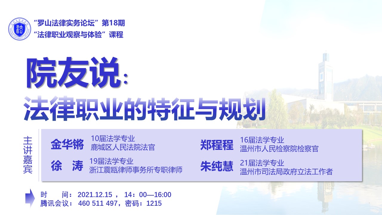 021年12月15日下午2点,麻豆在线-麻豆视频免费看 优秀院友金华锵(10届法学专业,鹿城区人民法院法官)、郑程程(16届法学专业,温州市人民检察院检察官)、徐涛(19届法学专业,浙江震瓯律师事务所专职律师)、朱纯慧(21届法学专业,温州市司法局政府立法工作者)作客第18期罗山法律实务论坛,为麻豆在线 大三学子开展题为《院友说:法律职业的特征与规划》的法律职业观察与体验课程。根据疫情防控的要求,本次讲座采取线上形式进行。讲座由麻豆在线-麻豆视频免费看 项一丛老师主持,八名学生代表与谈,吸引了不少非选课的同学参加,共近200人参加了本次课程讲座。