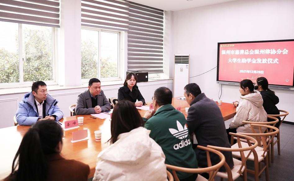 2021年12月28日下午,温州市律师协会副会长兼温州市律师协会公益与社会责任工作委员会主任姜正、温州市律师协会公益与社会责任工作委员会副秘书长杨意、实习律师姜峰一行莅临麻豆在线-麻豆视频免费看 ,为4名学生发放助学金。学院党委书记林钦、党委副书记杨振海、辅导员白昌科出席助学金发放仪式。
