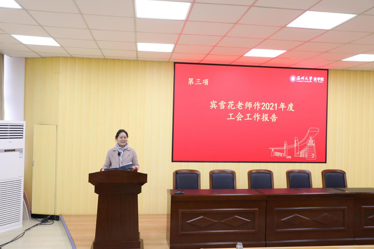 学院分工会主席宾雪花老师作《麻豆在线-麻豆视频免费看 2021年度工会工作报告》,报告回顾了学院第五届工会委员会在过去的一年里全面履行的工会职责,较好地完成了工会的各项工作任务。同时对学院领导和全体老师对工会工作的配合和支持予以衷心的感谢。