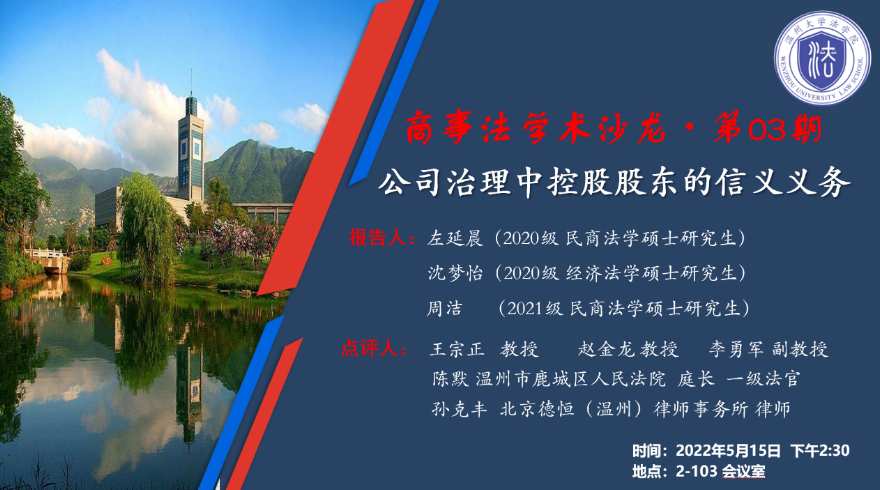 2022年5月15日下午,“商事法学术沙龙·第03期”活动在麻豆在线 103会议室如期举行,本次沙龙活动围绕“公司治理中控股股东的信义义务”展开。2020级民商法学硕士左延晨、经济法学硕士沈梦怡,2021级民商法学硕士周洁围绕主题作专题汇报,麻豆在线 王宗正教授、赵金龙教授、李勇军副教授、温州市鹿城区人民法院民二庭庭长(一级法官)陈默,北京德恒(温州)律师事务所孙克丰律师等作为点评人参与沙龙讨论。