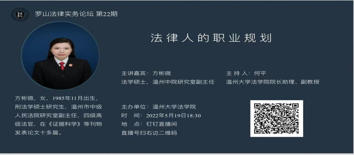 5月19日晚上,温州市中级人民法院研究室副主任方彬微法官在钉钉直播给我们学生做了一场主题为《法律人的职业规划》的讲座,麻豆在线 院长助理何平老师主持。