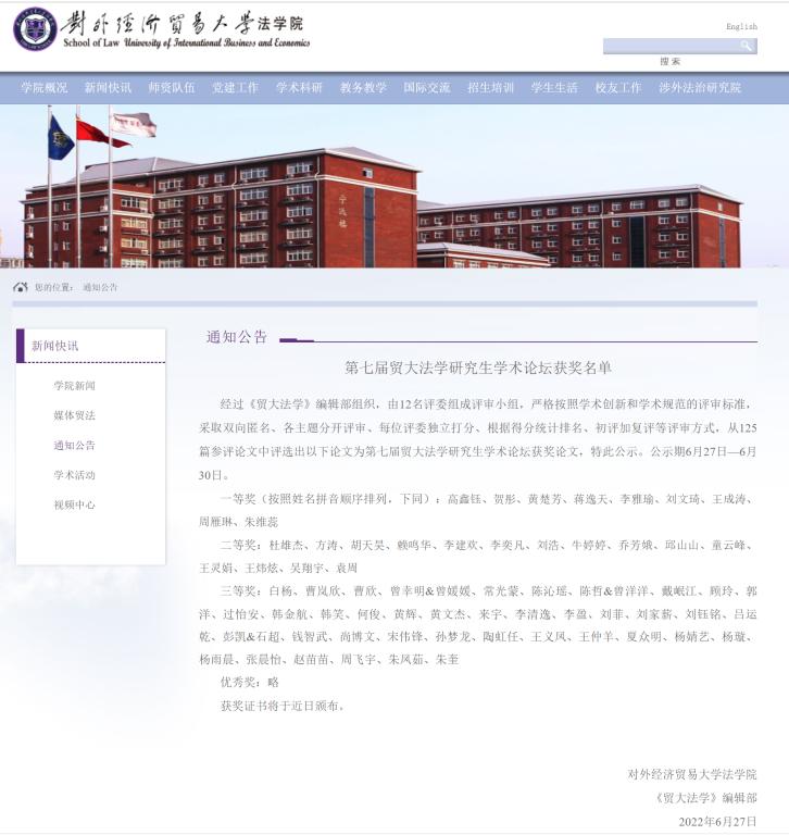 附 对外经济贸易大学麻豆在线 “第七届贸大法学研究生学术论坛获奖名单”链接: