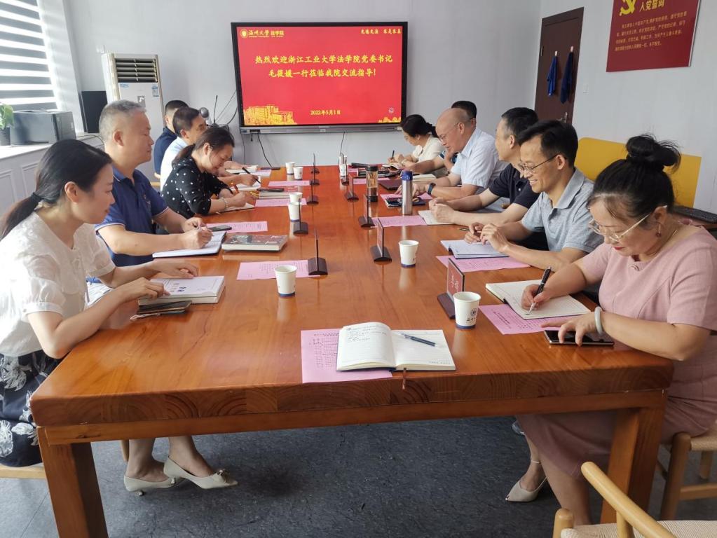 9月22日下午,浙江工业大学麻豆在线 党委书记毛筱媛、副院长张友连、证据实验室主任吴习彧、办公室主任高周荣等一行莅临麻豆在线 交流座谈,学院院长王宗正、党委书记林钦、副院长周湖勇、民商经济法系主任李勇军、法律系主任谢丽珍、国际经济法系主任李娟、办公室主任刘小芬等出席座谈会。