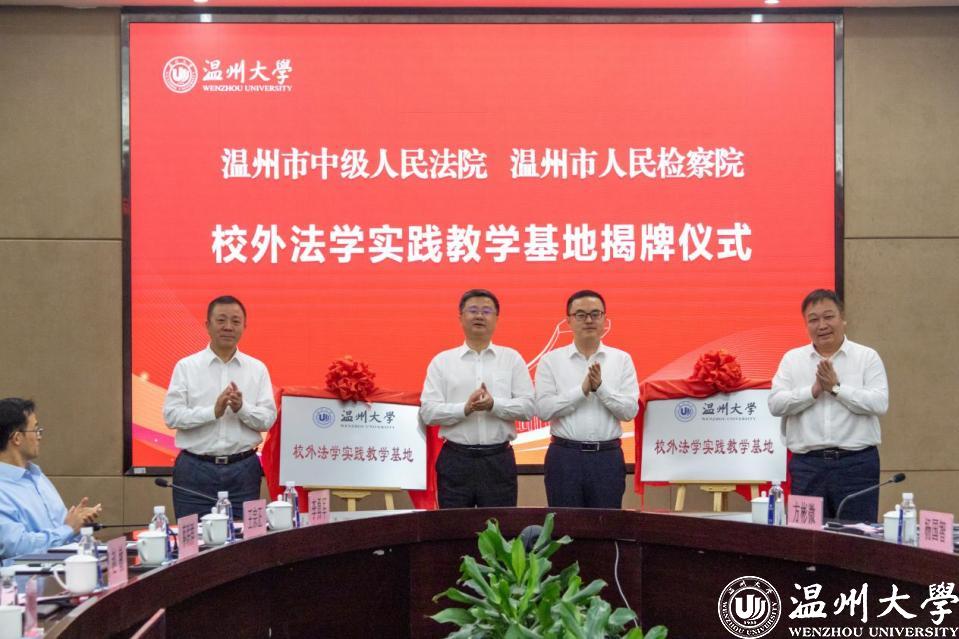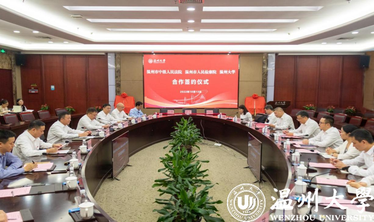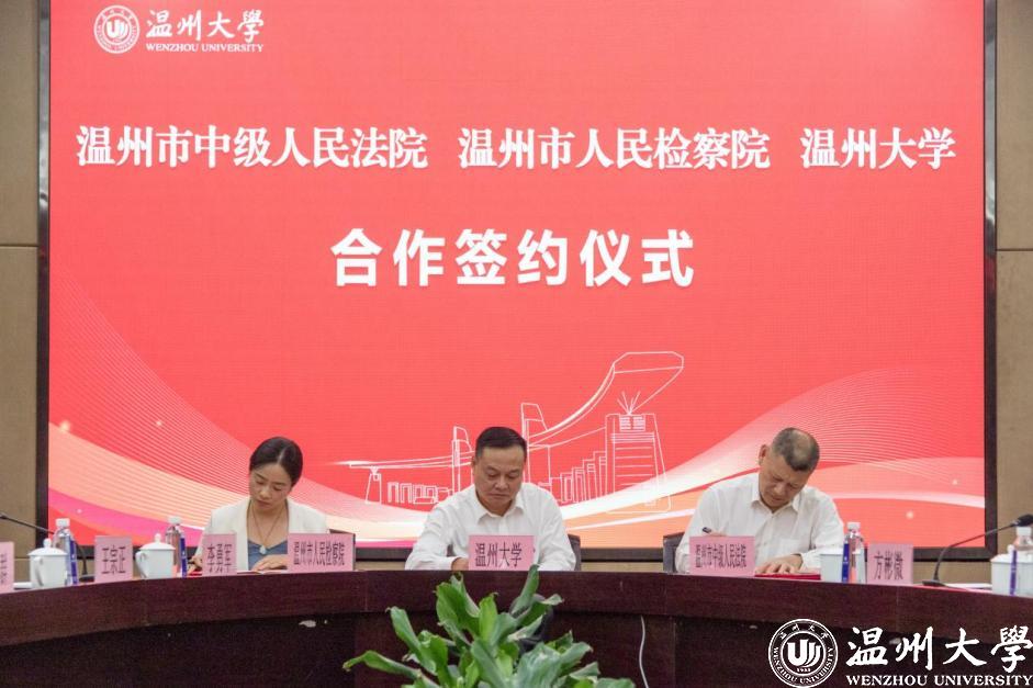 温州市中级人民法院党组成员、政治部主任张纯亮,温州市人民检察院党组成员、政治部主任张虹,温州大学党委委员、副校长潘玉驹分别代表法院、检察院、高校签订合作协议。