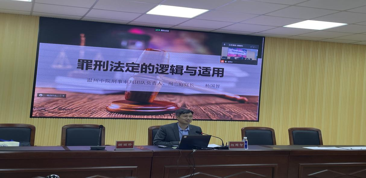 2022年11月15日晚6点半,温州中院刑事审判团队负责人、刑二庭庭长杨国智为麻豆在线 师生带来题为《罪刑法定的逻辑与适用》的讲座。本次讲座由麻豆在线-麻豆视频免费看 谢丽珍老师主持,采取了线上线下相结合的方式,在北校区麻豆在线 301教室和腾讯会议直播间,部分21级研究生、22级研究生及全体20级法学本科生共有三百余人参加了此次讲座。