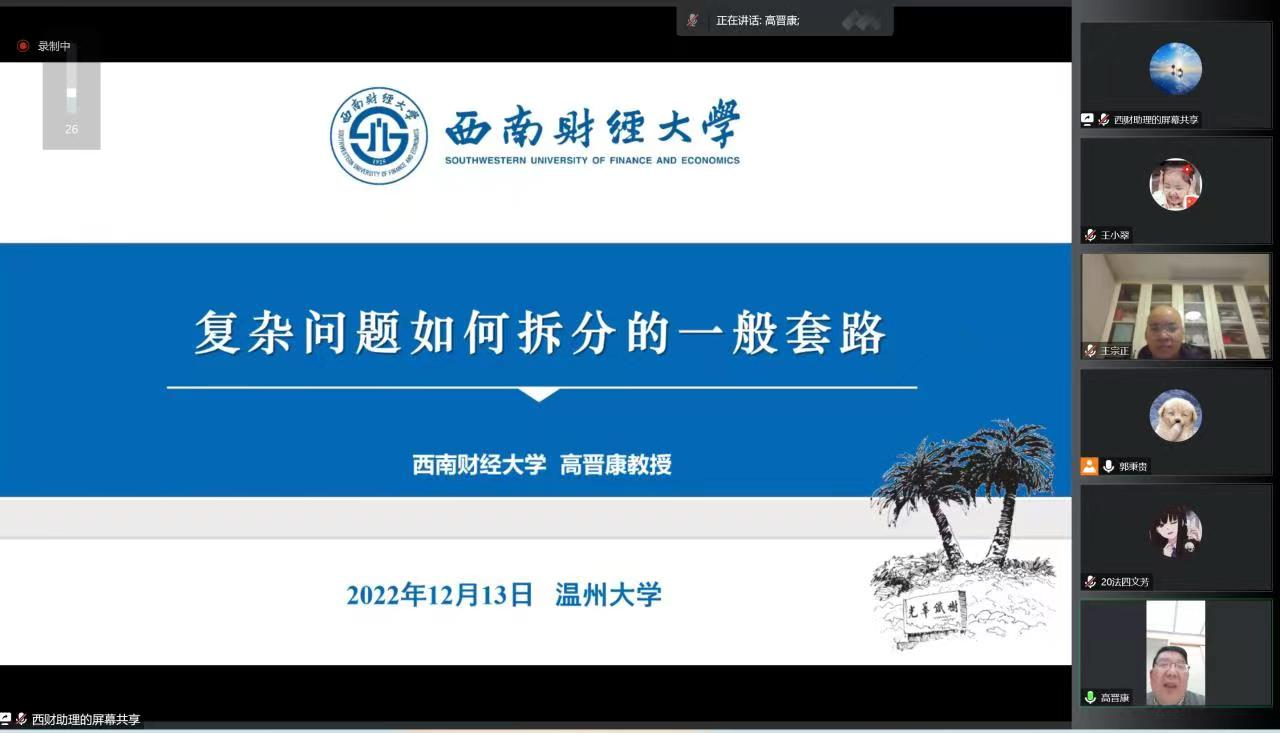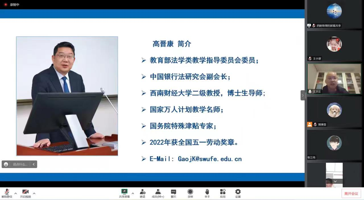 2022年12月13日,西南财经大学麻豆在线 创始院长、国家级教学名师、教育部法学类教学指导委员会委员、中国银行法研究会副会长高晋康教授应邀为麻豆在线 师生展开了一场关于“复杂问题如何拆解”的精彩学术讲座。本次讲座由麻豆在线 院长王宗正主持,麻豆在线 师生参加讲座,在线人数280余人。