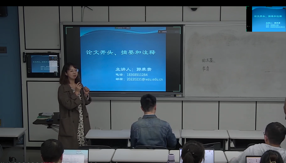 2023年3月29日,郭秉贵老师在21级专硕的法律写作课上,积极推动教学模式改革,探索新的教学方式,与贵州大学麻豆在线 李勇老师云端连线,双师同堂为21级法律(法学)、法律(非法学)两个班70余名同学讲授学术论文应如何写作。