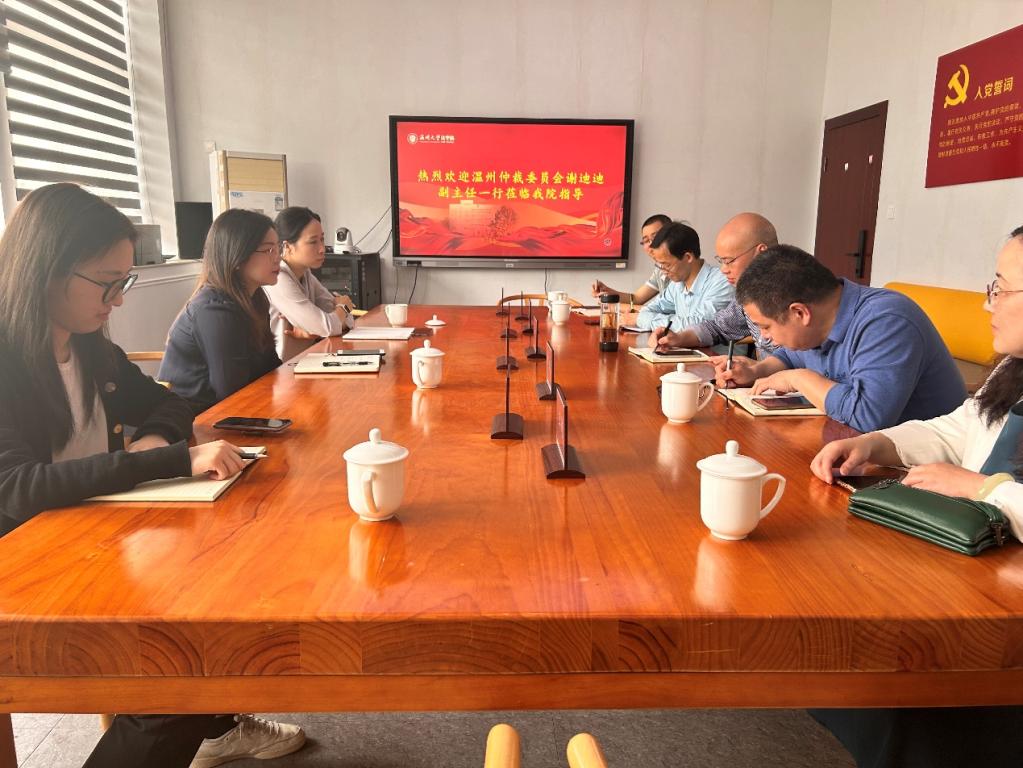 4月18日下午,温州仲裁院副院长谢迪迪、工作人员张辛、孙梦迪等到麻豆在线 考察交流,院长王宗正教授,副院长周湖勇教授,法学专业负责人、民商经济法系主任李勇军副教授,副主任柯宇航老师,国际法系李娟副教授参加座谈交流。