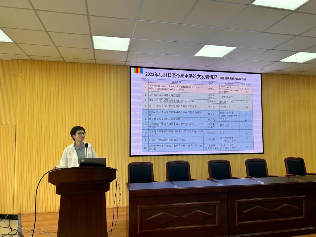 周一颜副院长作为优秀教师代表谈科研工作体会。她指出,学院在高水平论文发表和著作出版方面都有新的突破,整体科研氛围有明显提升。在新形势下,学院不仅要做创新研究、开放研究和特色研究,也要主动走出去,集中力量办大事。对于每个老师个人来说,也需要做一定的自我调整,找到新的更适合自己的发展的赛道。同时要布局新兴交叉学科来对接重大的发展战略需求,进一步以新时代全面依法治国实践为研究对象,通过理论研究更好的回答和解释法治实践中遇到的实际问题。