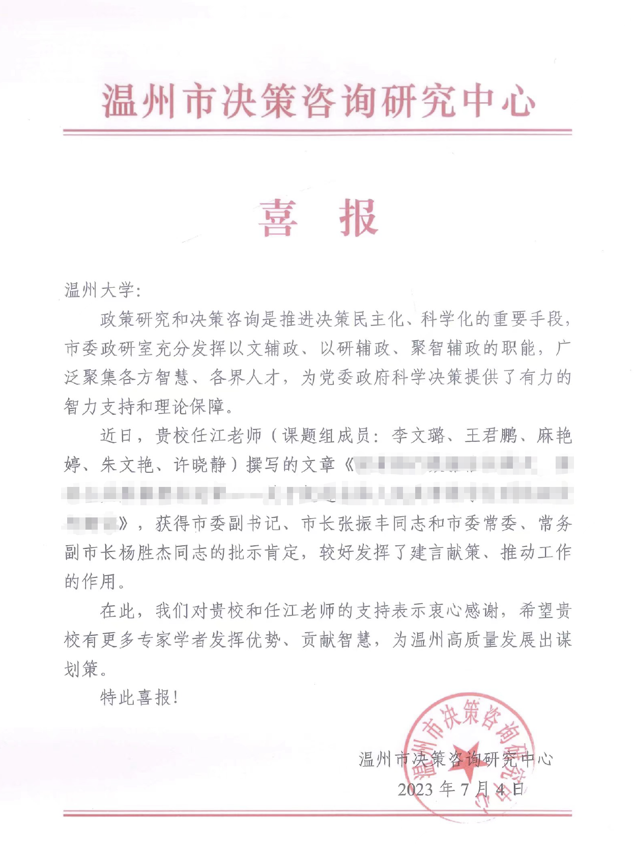 近日,由温州大学私法研究中心任江副教授撰写的对策建议报告获得温州市委副书记、市长张振丰同志和市委常委、常务副市长杨胜杰同志的批示肯定。