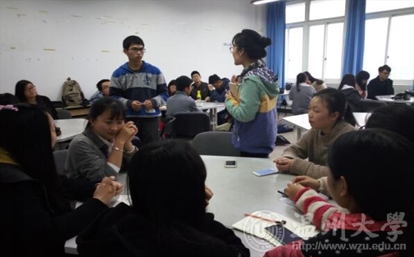 活动先以小游戏的方式进行热场,活跃了现场气氛,调动了同学们的参与热情。我们将参加活动的同学分为5个小组,由各组组长抽取本组的话题,例如"你愿意做大海里的小鱼还是小溪里的大鱼"、"你如何看待不丹国王所提出的国民幸福指数高于国民经济指数这一理论"等等。同学们都积极参与讨论,踊跃表达自己的观点。经过40分钟的讨论后,各小组以辩论、总结等形式向大家展示了本组话题的讨论结果,其中第4组更是以小品的展示形式将活动推向高潮。
